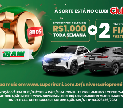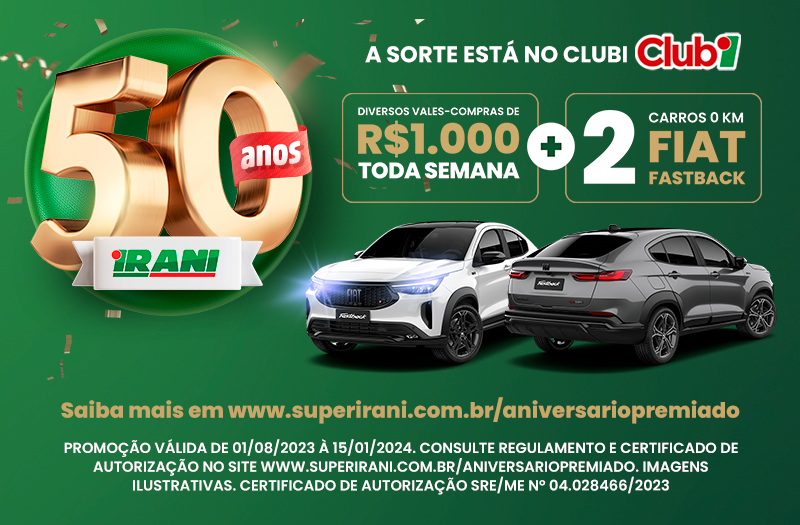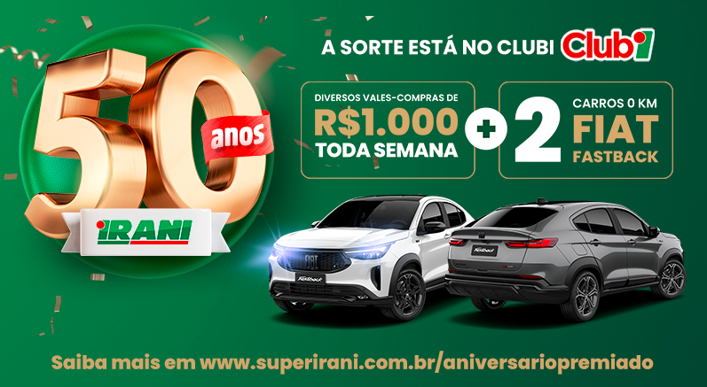 O Irani, uma das marcas mais queridas de Cascavel, comemora seu aniversário de 50 anos com uma promoção especial para seus clientes do Clubi. A partir de 01/08, a cada R$70 reais em compras, os clientes receberão um número da sorte para concorrer a prêmios incríveis: dois Fiat Fastback novinhos em folha e vales-compras de mil reais toda semana!