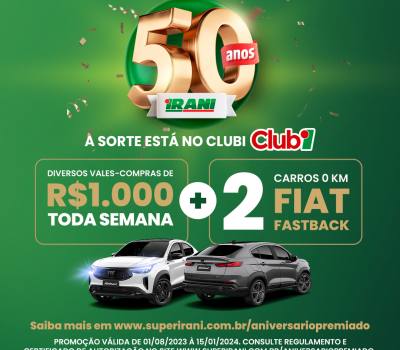 Serão sorteados dois veículos Flat Fastback e vale-compras de R$ 1 mil com sorteios todas as semanas. "A cada R$70,00 em compras, o cliente cadastrado no Clubi garante um número da sorte. Se o pagamento for no Cartão Irani, o número da sorte se multiplica por dois. E se comprar produtos de marcas aceleradoras, o cliente ganha mais um número da sorte".