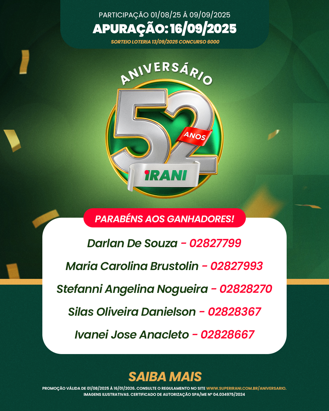 Durante o Aniversário de 52 anos do Irani, serão realizados 5 sorteios oficiais pela Loteria Federal, com apuração interna após cada extração. Cada etapa tem uma data limite de participação, e o último sorteio será o mais esperado: o do Hyundai Creta zero km!