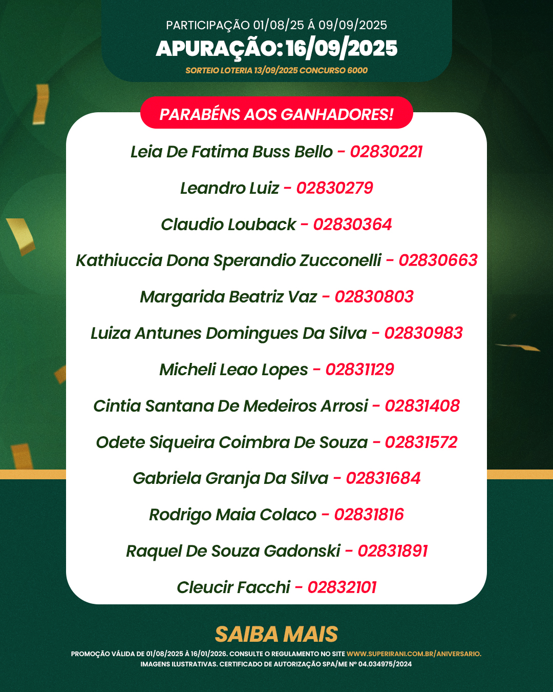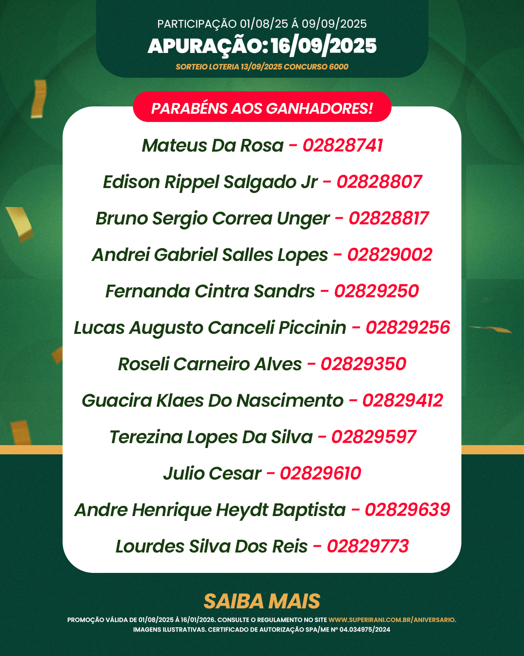 Participação 01/08/25 á 09/09/2025. Sorteio Loteria 13/09/2025 Concurso 6000. Apuração: 16/09/2025