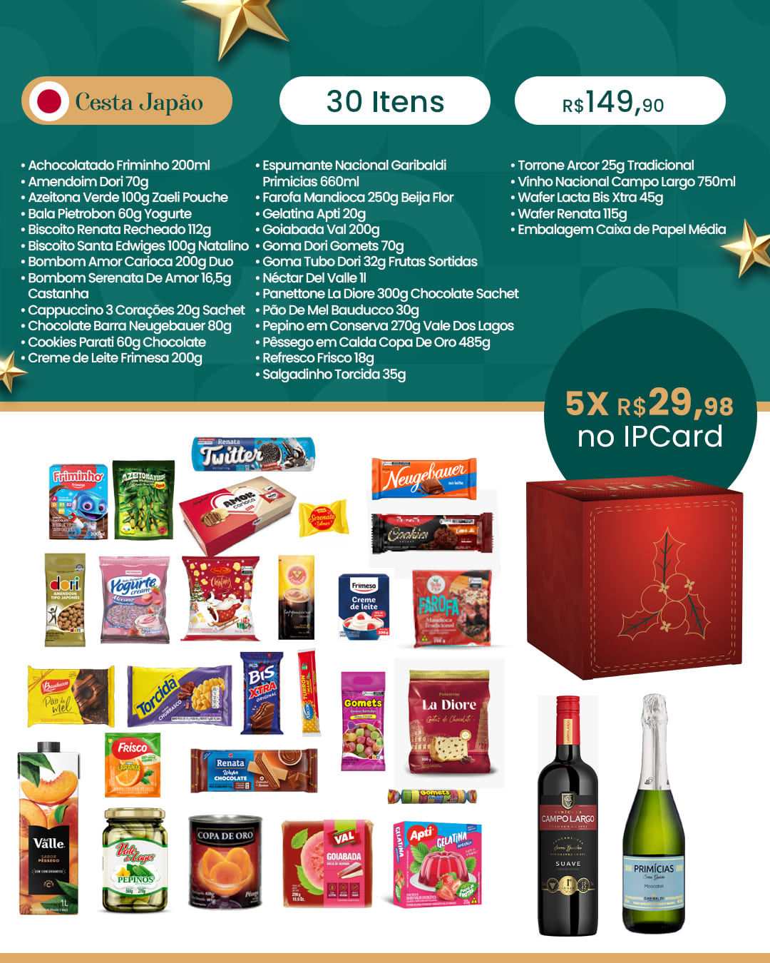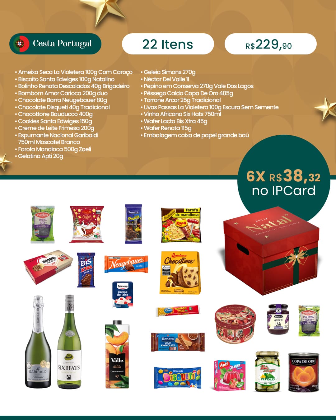É tempo de celebrar mais um ano, espalhar esperança e alegria, e de presentear as pessoas que te acompanharam durante o ano todo. A seleção de cestas conta com versões com panetones com gotas de chocolate, espumantes, vinhos nacionais ou importados, geleias, doces, bombons, chocolates e muito mais.