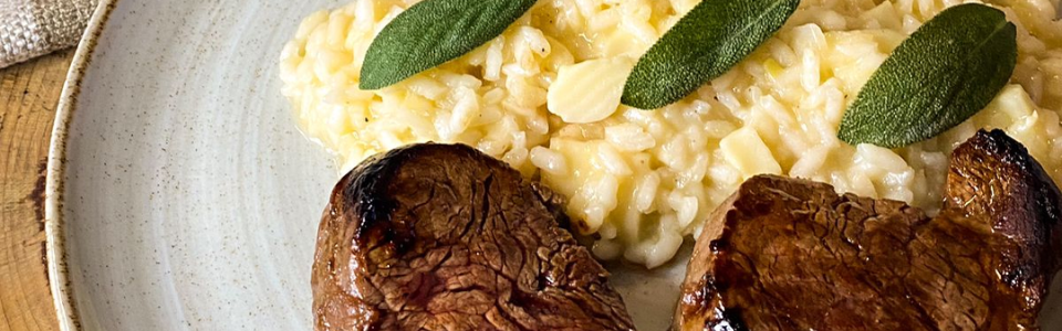 Risoto de Palmito com Posta Filé Mignon Grelhado