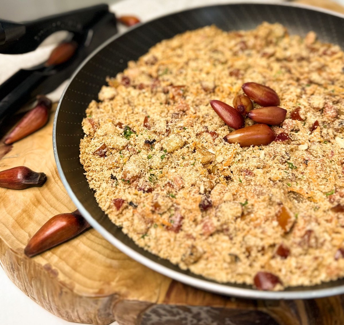Na mesma frigideira coloque a cebola e a manteiga. Refogue a cebola por aproximadamente 2 minutos e incorpore a cenoura. Mexa bem e acrescente os pinhões picados. Aguarde cozinhar apenas até o pinhão esquentar. Acrescente a farinha de mandioca, mexa sem parar (fogo baixo) por aproximadamente 5 minutos, a farinha precisa tostar e a sua cor ficar mais douradinha. Acerte o sal e agregue a pimenta do reino moída. Coloque o bacon, aguarde cozinhar mais uns minutinhos e finalize com a salsinha picada. Fica maravilhosa demais! Excelente acompanhando para carnes e churrasco.